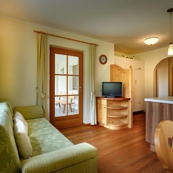 Die "Marinzen" liegt absolut ruhig im Erdgeschoss unseres Hauses mit direktem Zugang zum sonnigen Garten. Auf der privaten Terrasse lassen sich laue Sommernächte bei einem Glas Südtiroler Wein genießen, begleitet nur vom Zirpen der Grillen. Ideal für Paare, wird sie aber auch gerne von Alleinreisenden auf der Suche nach wohltuender Ruhe gebucht.