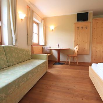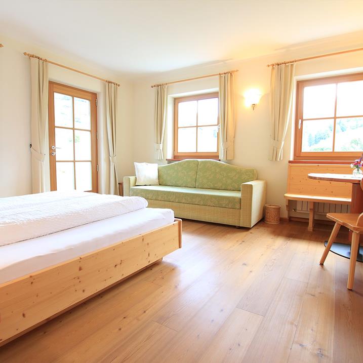 Sleeping room with double bed | seating corner and couch | bathroom with shower, WC and bidet | TV | refrigerator | wooden floor | panoramic mountain view and direct access to the sunny garden